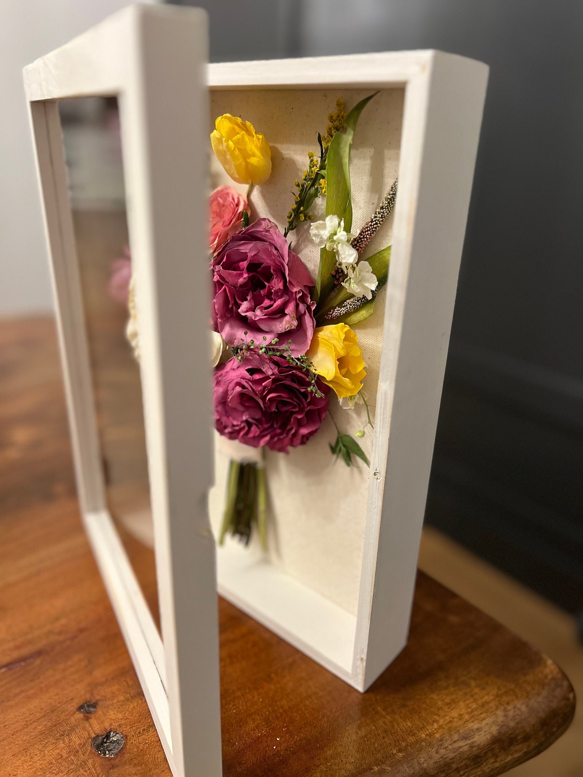 Step 3: Within 1-2 months of your event date, receive a stunningly arranged art piece in a 11"x14" wall keepsake box, ready to adorn your home with everlasting beauty.