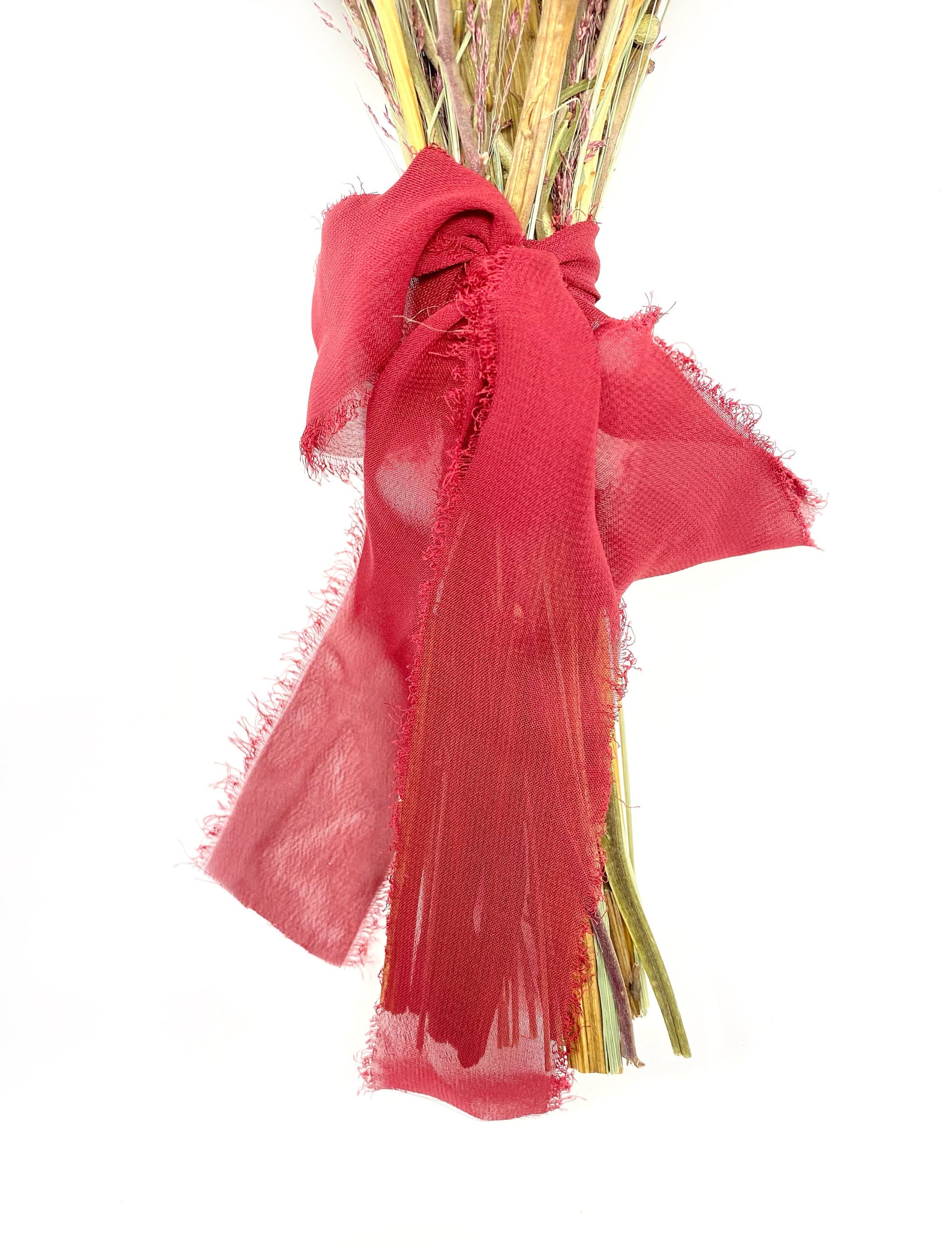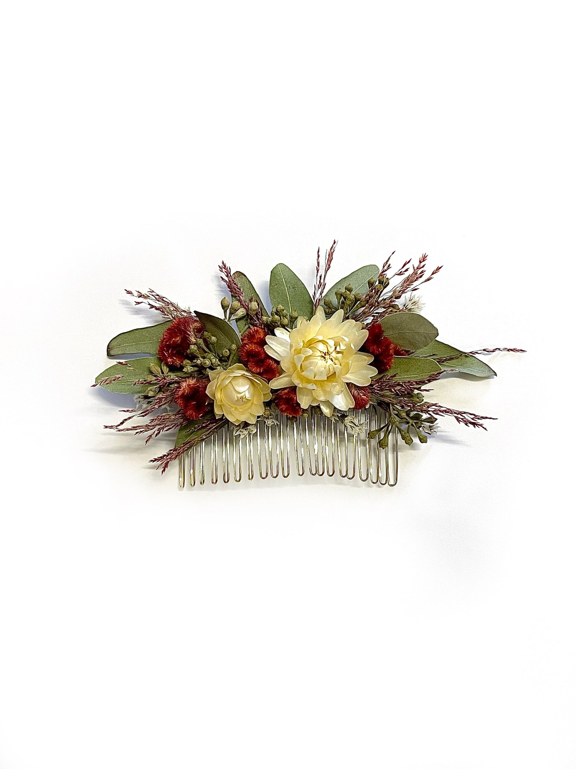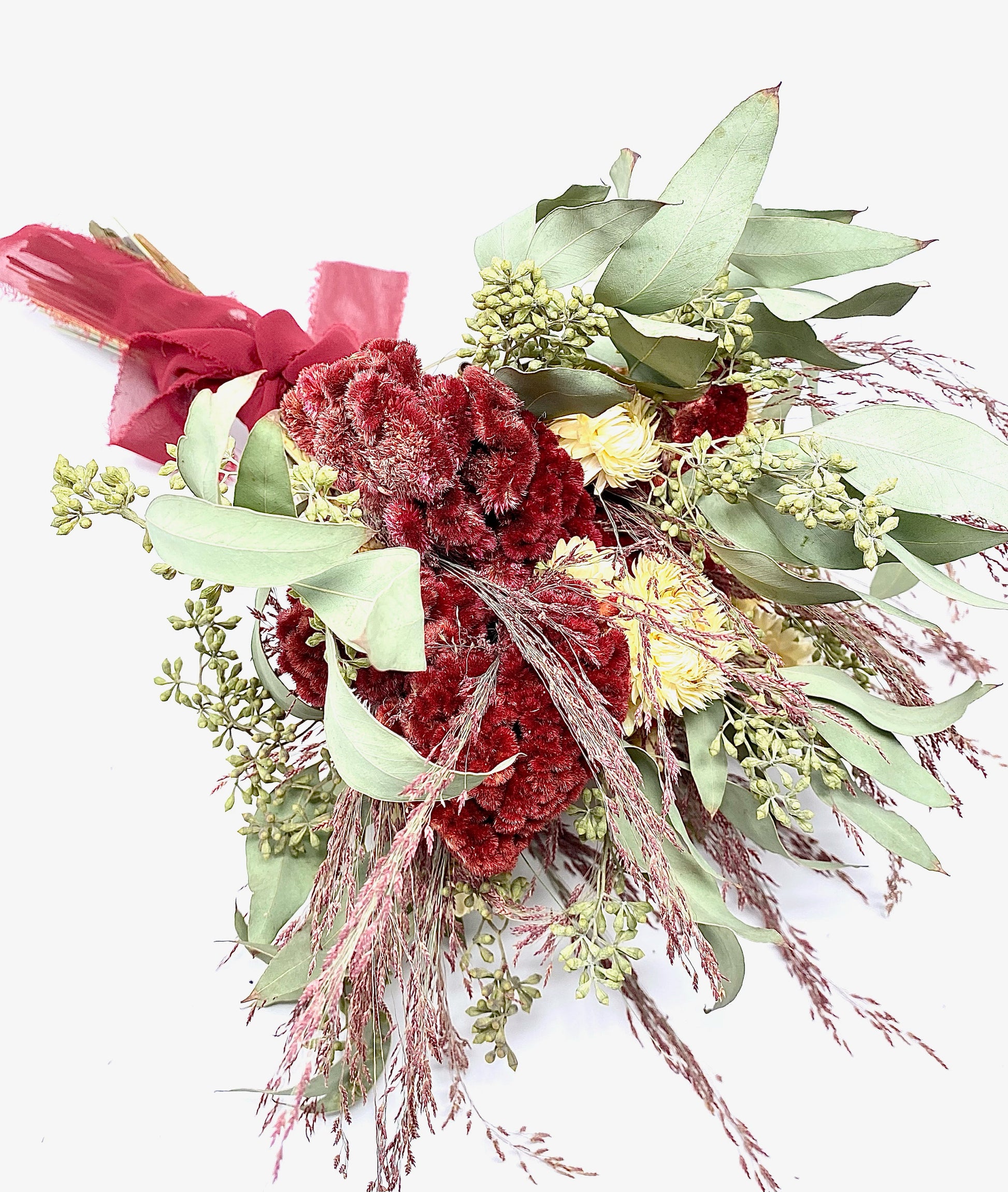 Includes the following flowers: Burgundy Coxcomb, Greenery, Strawflowers and Ruby Red Silk.