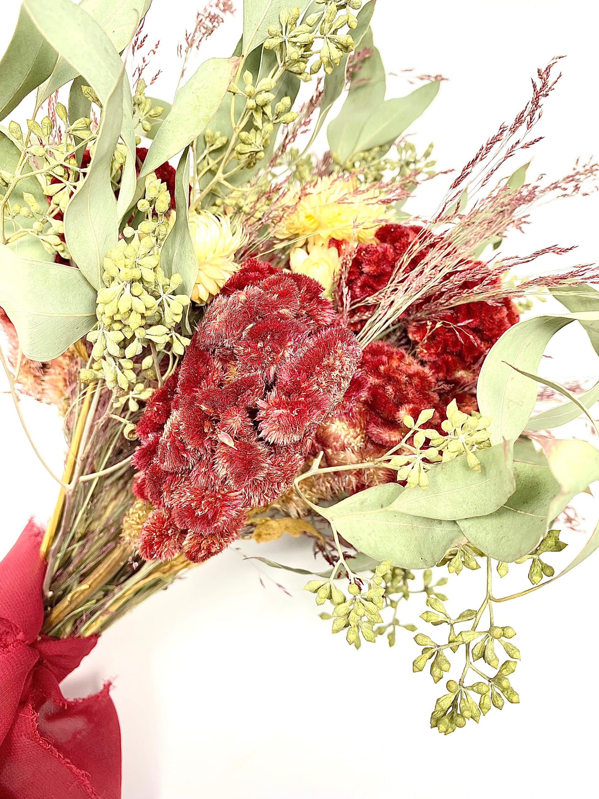 Christmas Bouquet, Dried Flowers, Bridal, Preserved Floral, Coxcomb, Strawflower, Greenery, Red and Green, Ruby silk, Burgundy