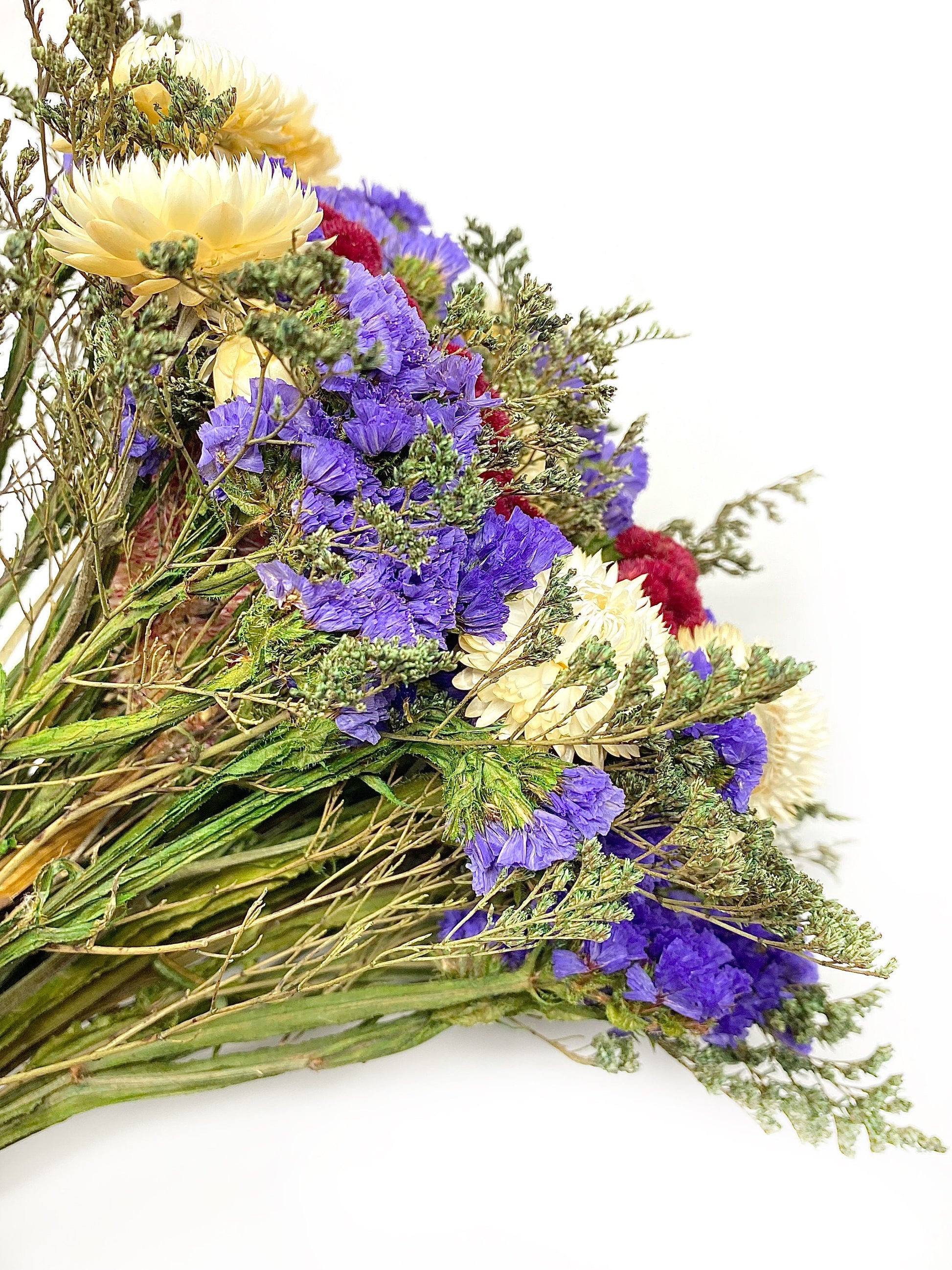This listing is for a beautiful Blue and Purple Floral bouquet tied with a cream-colored lace ribbon. It is made from all-natural dried and preserved flowers.