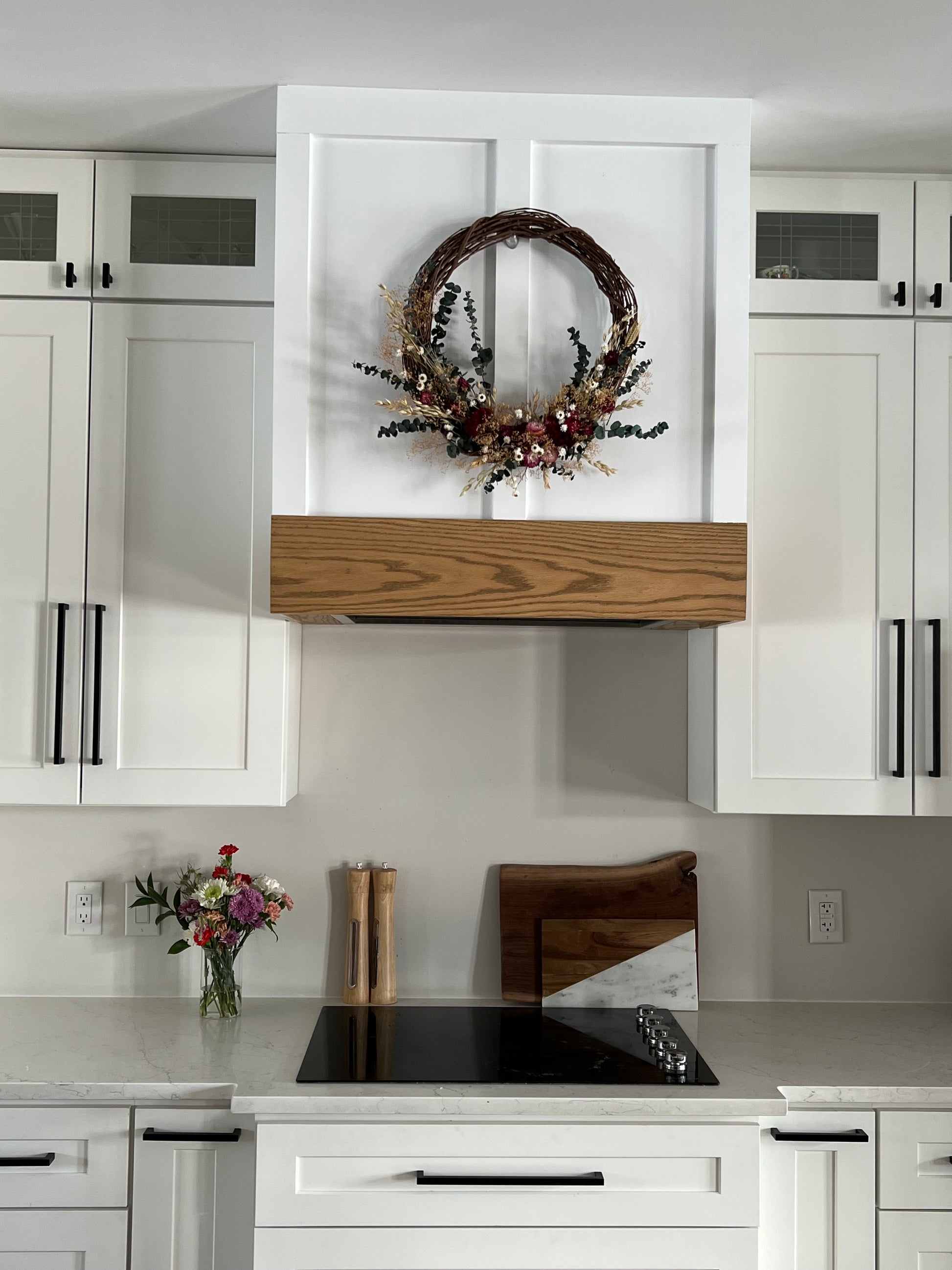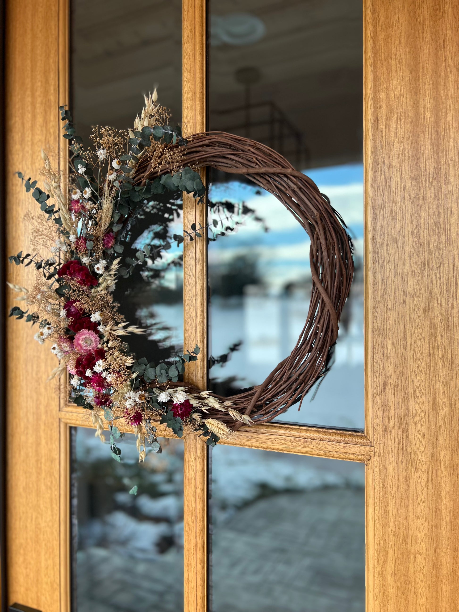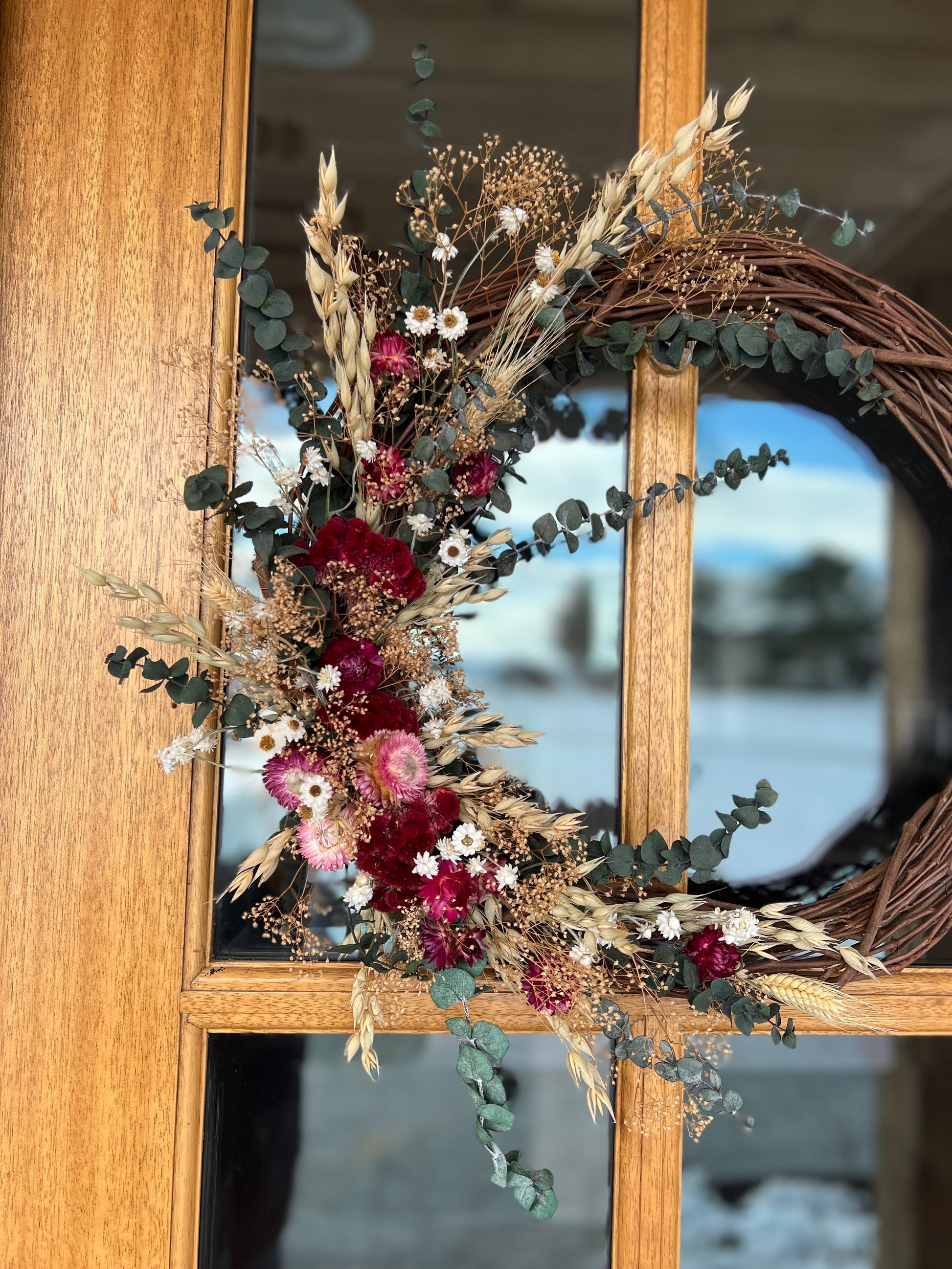 This wreath is made with a combination of grapevine wreath and dried and preserved flowers.