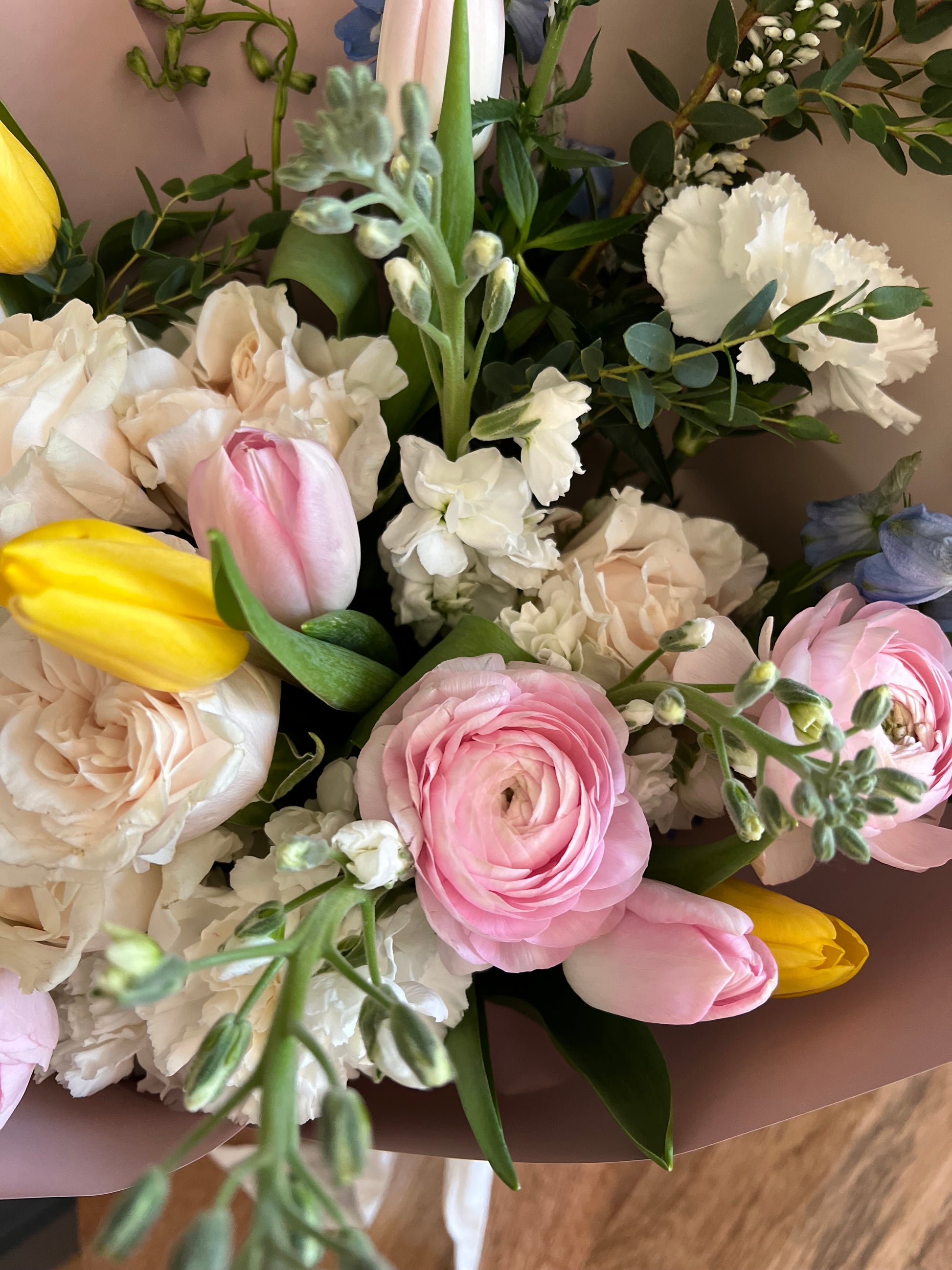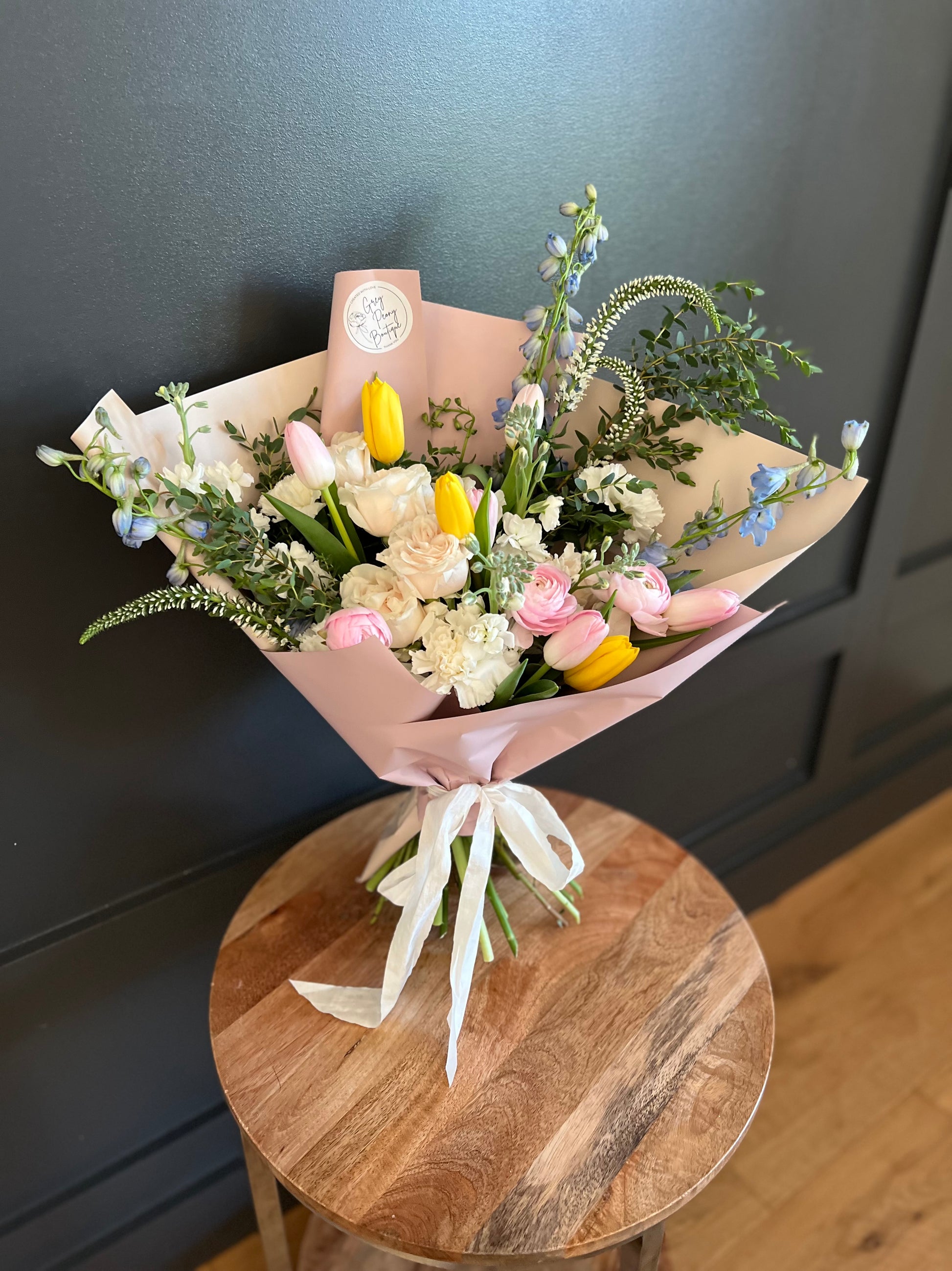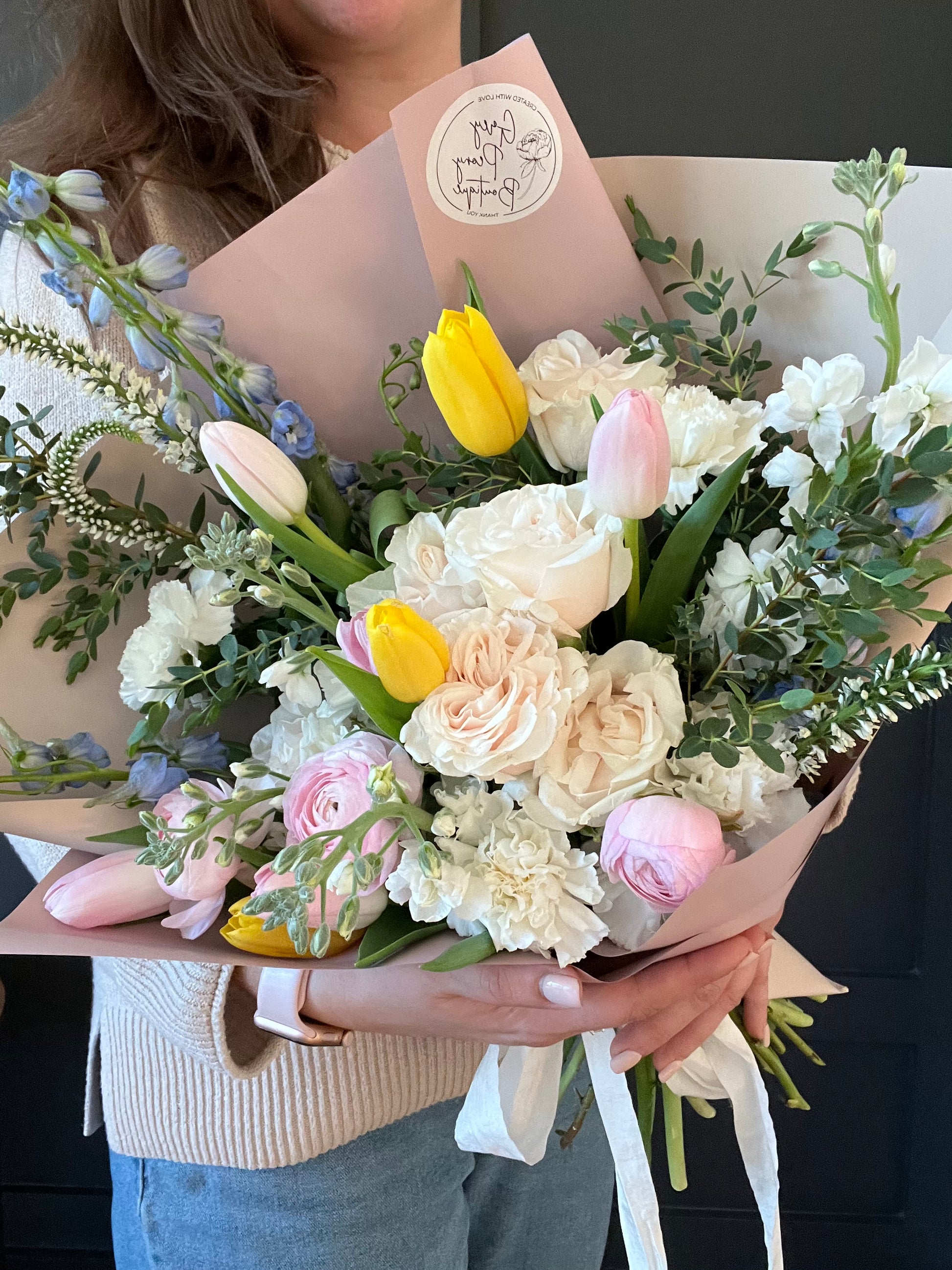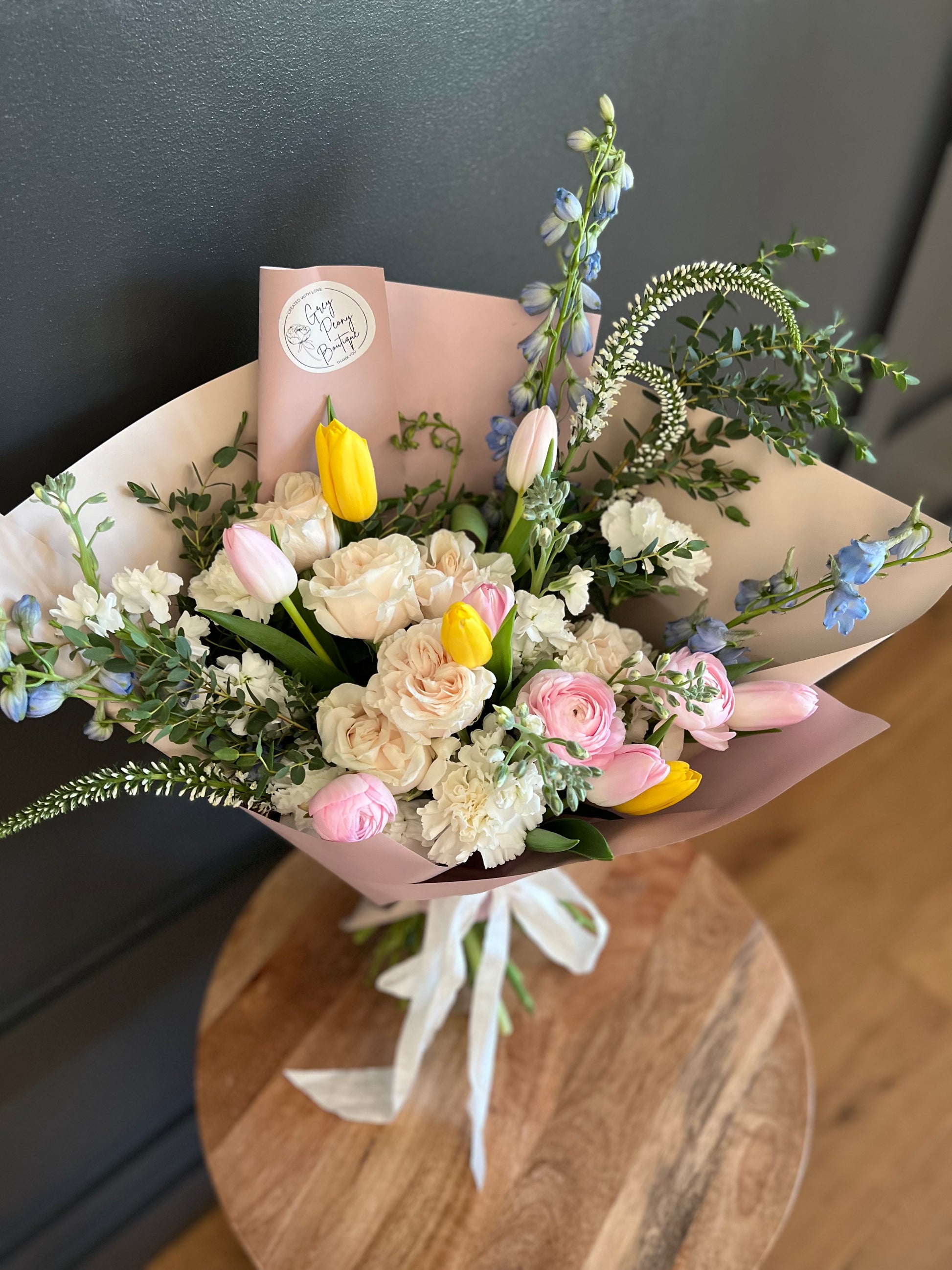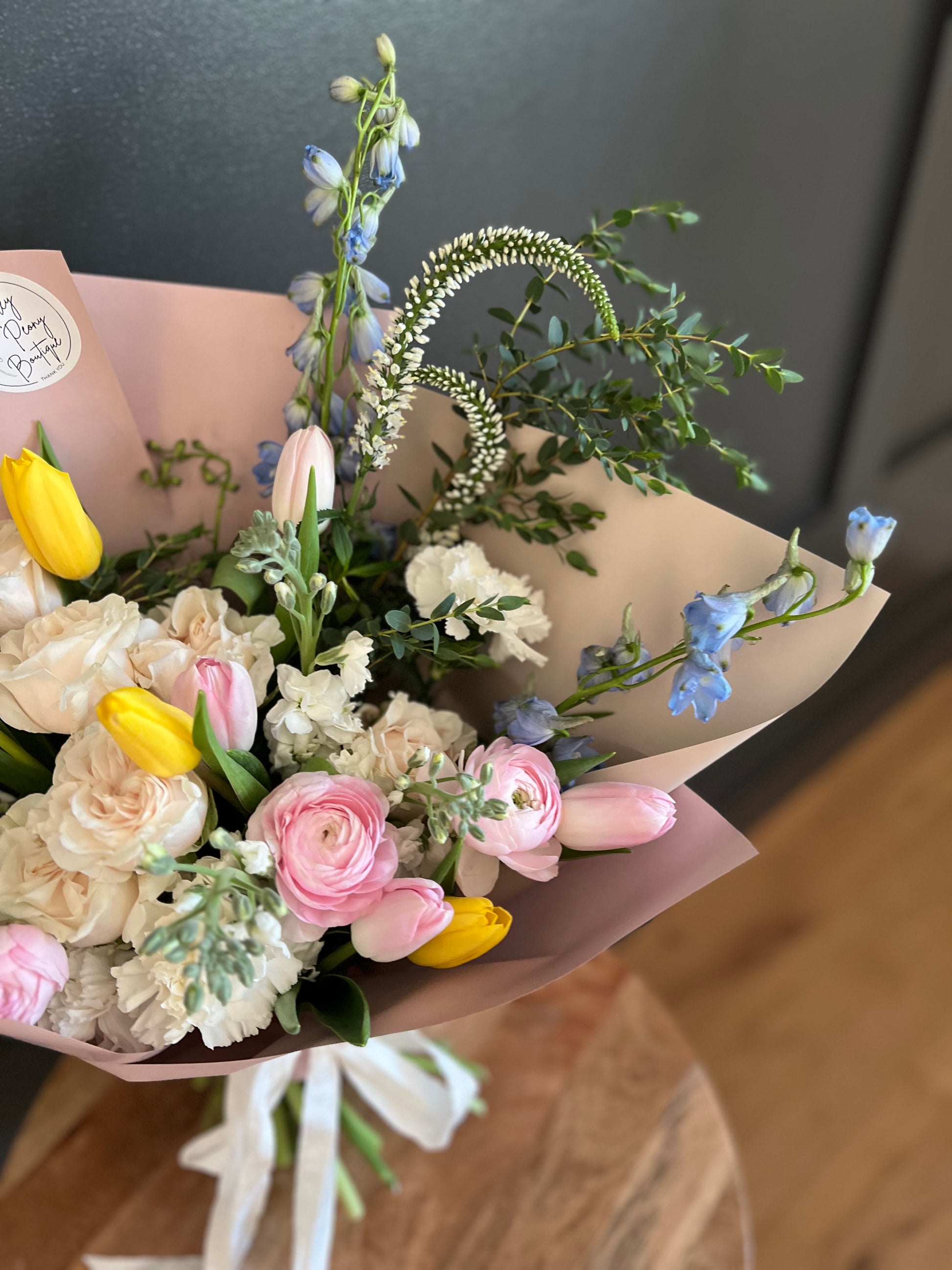 Each bouquet is carefully crafted with premium, seasonal blooms, wrapped in elegant paper and tied with a delicate ribbon for the perfect finishing touch. Whether it’s a small gesture or a grand statement, our bouquets are designed to make hearts bloom!
