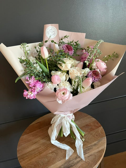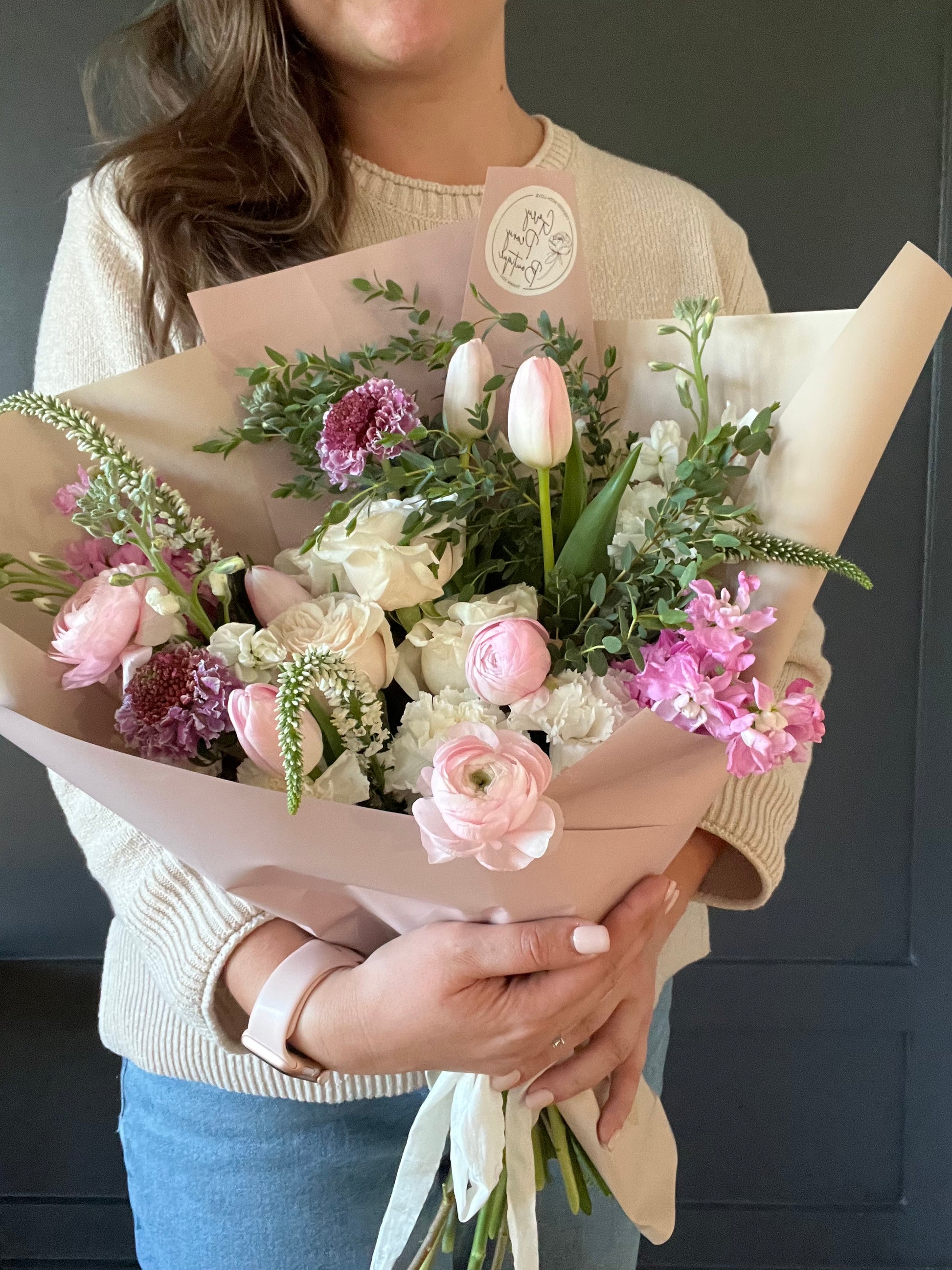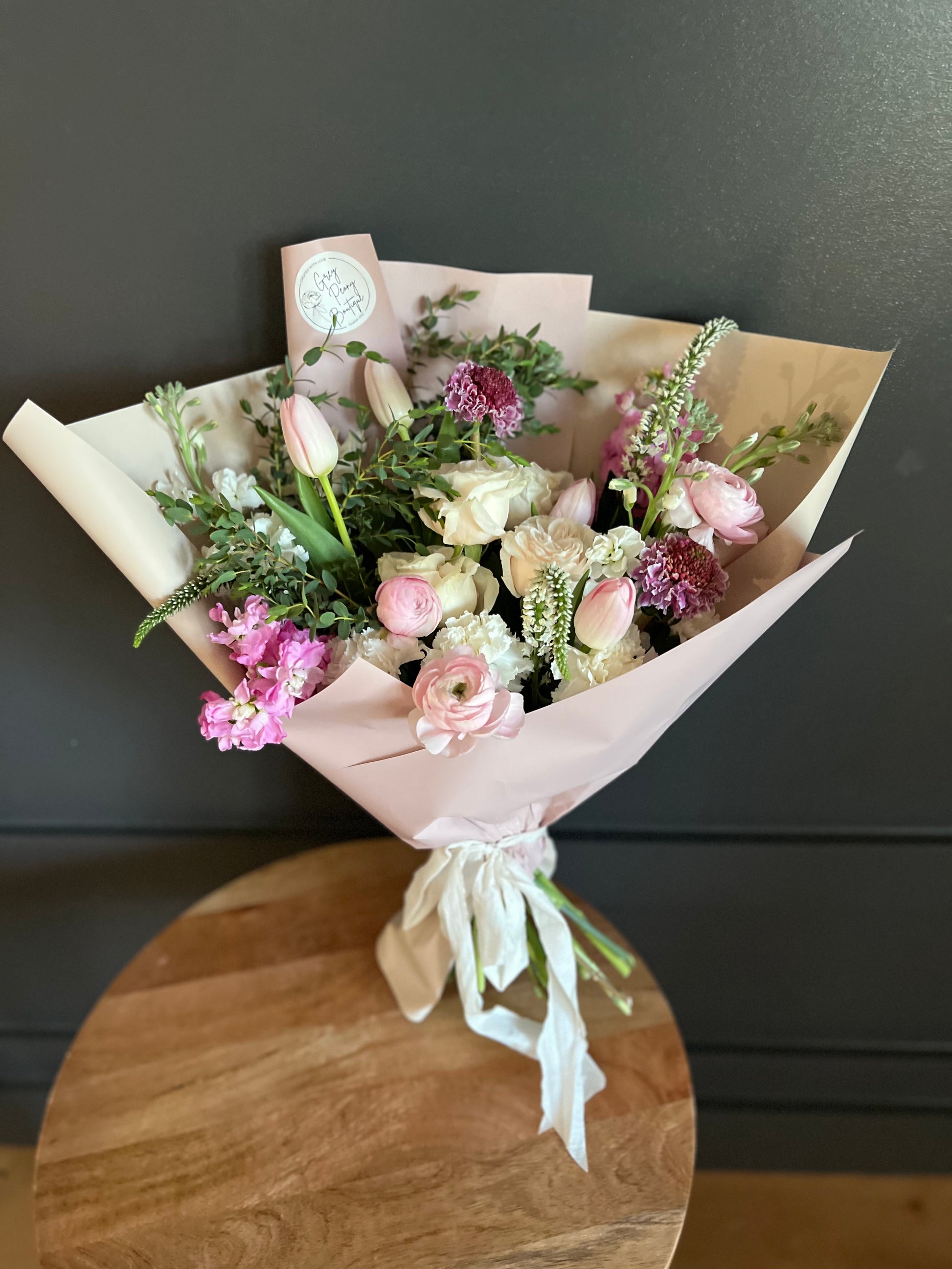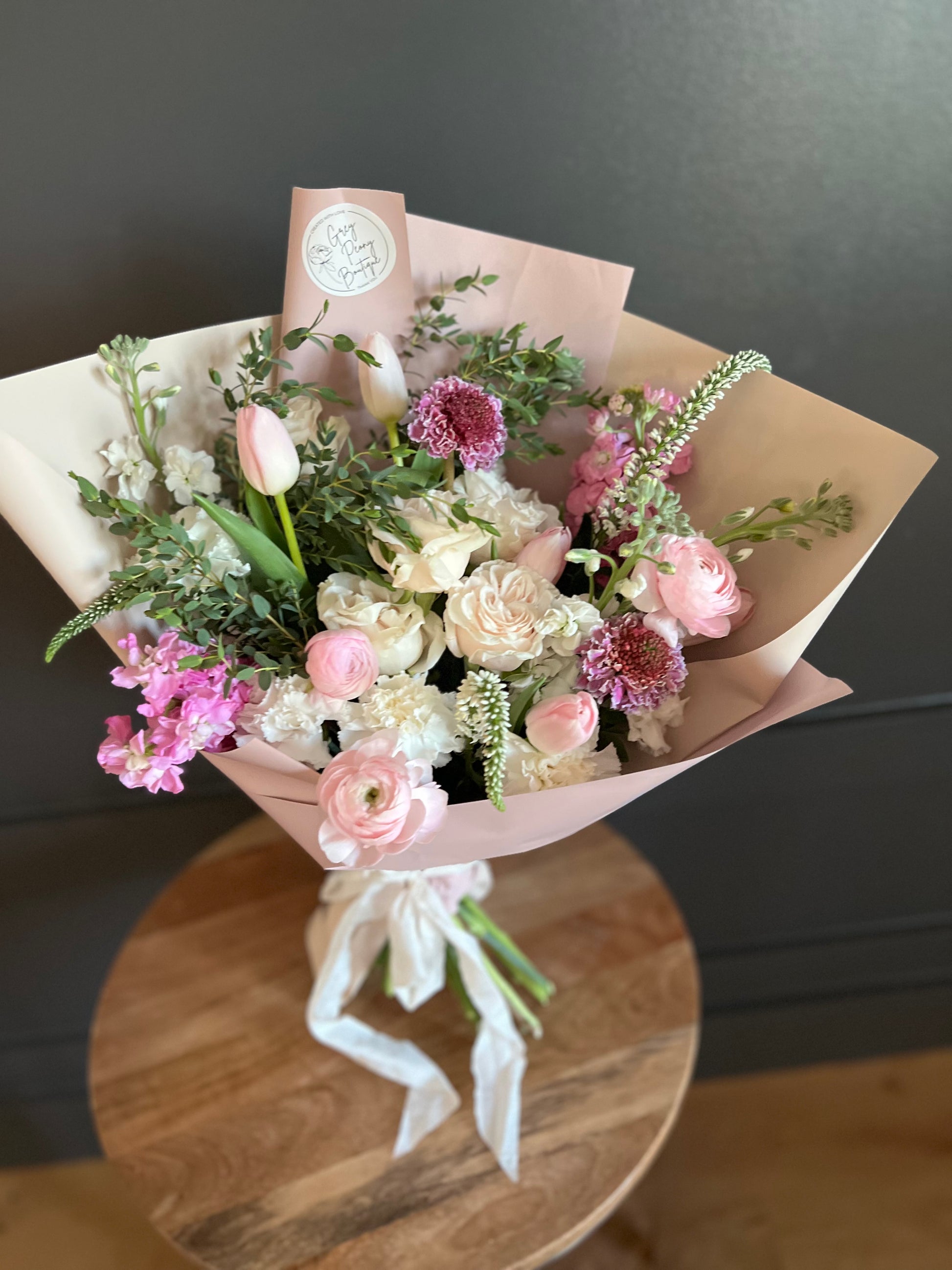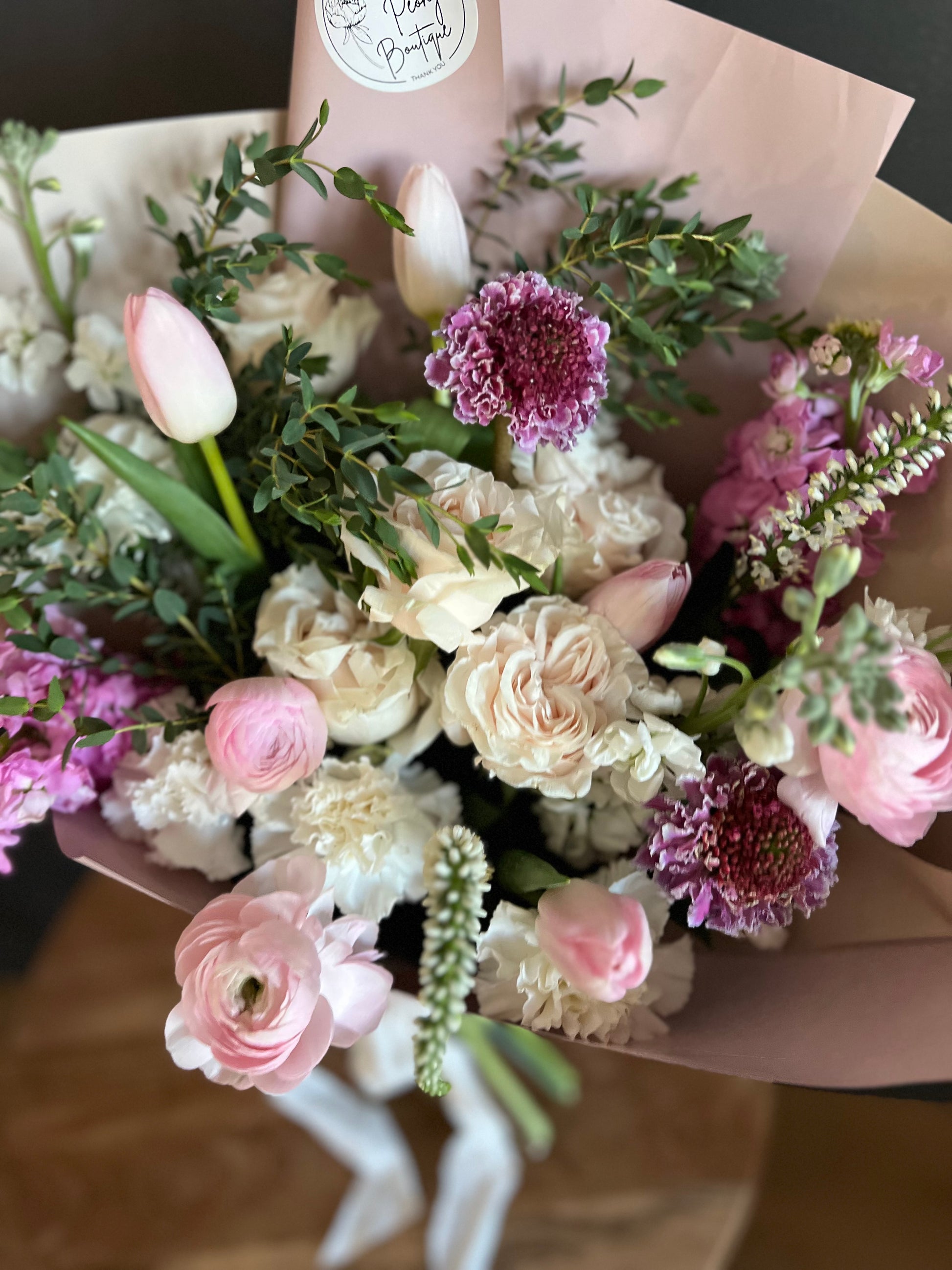 Each bouquet is carefully crafted with premium, seasonal blooms, wrapped in elegant paper and tied with a delicate ribbon for the perfect finishing touch. Whether it’s a small gesture or a grand statement, our bouquets are designed to make hearts bloom!