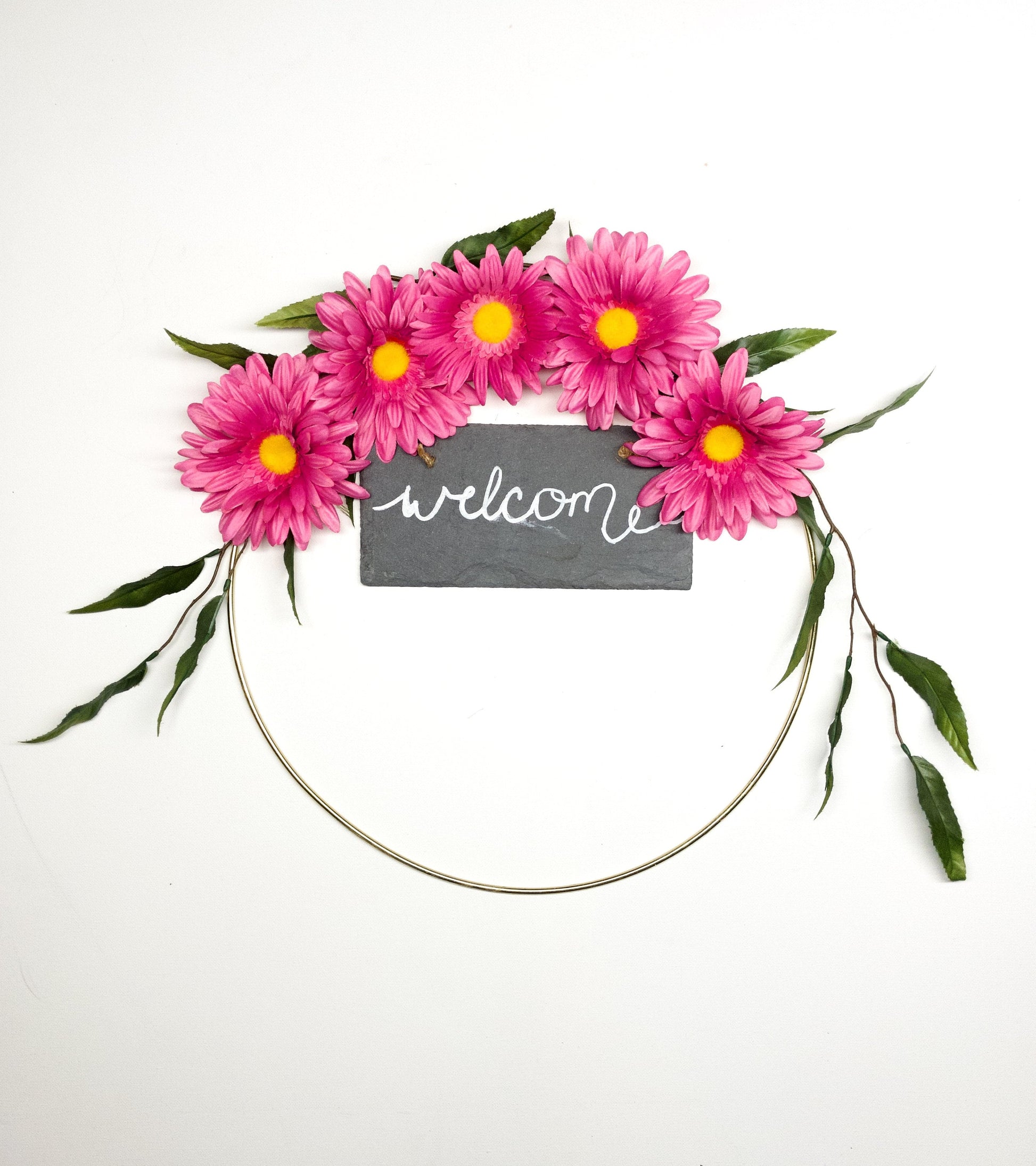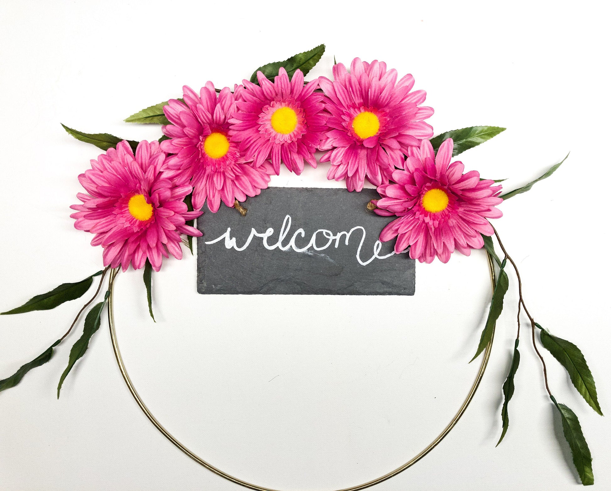 This wreath is made with a combination of a gold ring and faux pink daisy flowers and greenery with a black chalkboard welcome sign in the middle.
