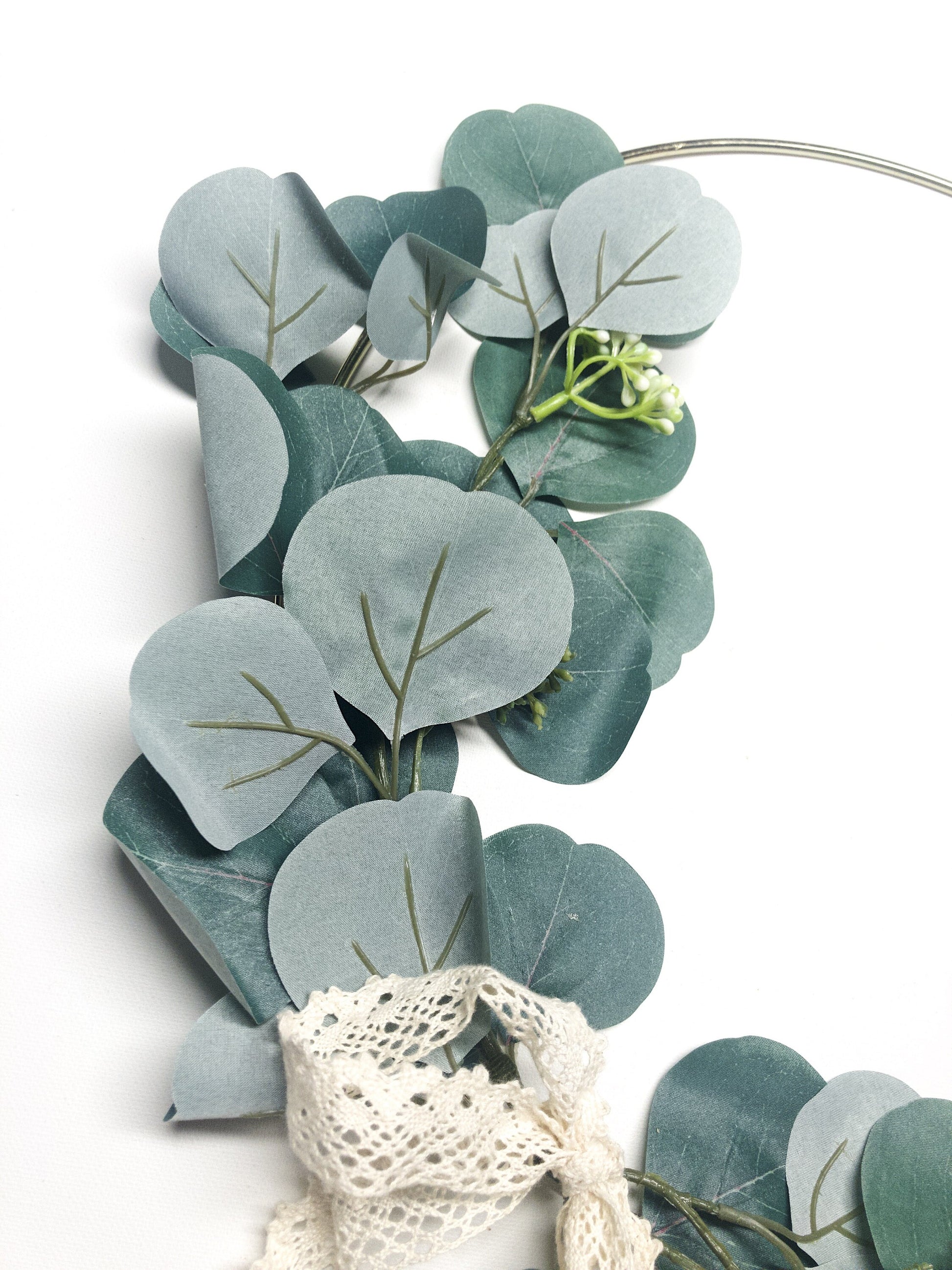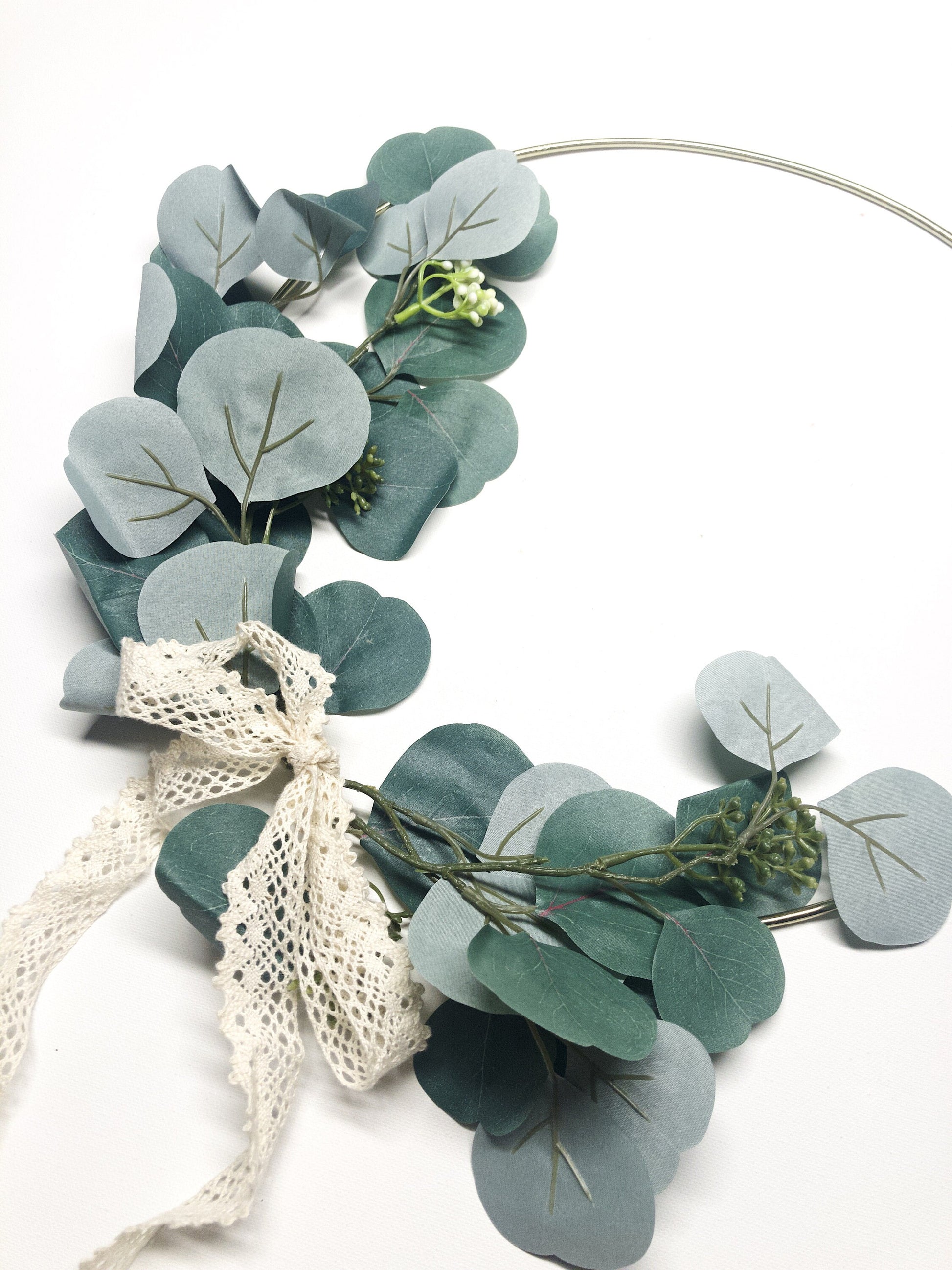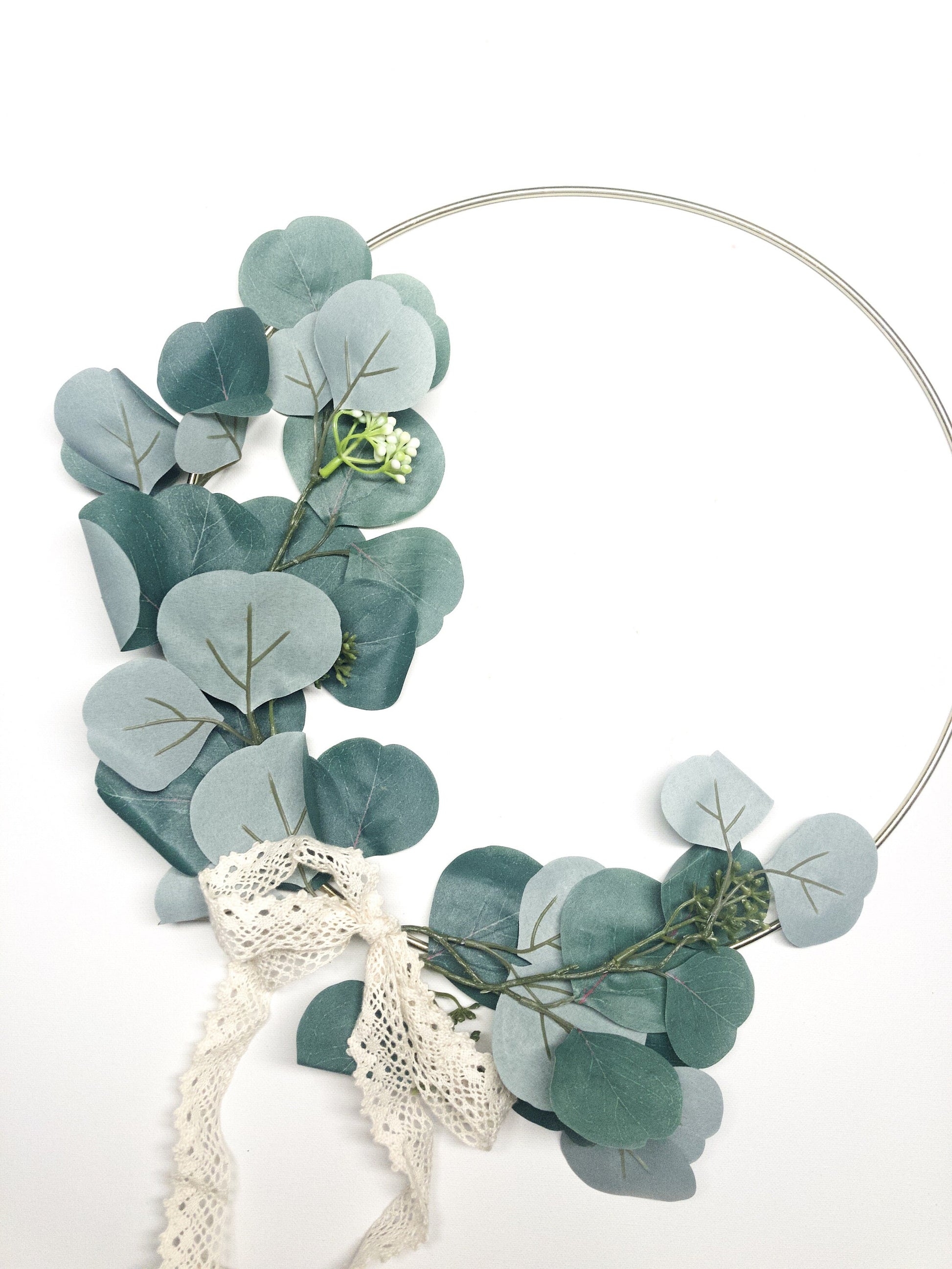 This wreath is made with a combination of a gold ring, faux silver dollar eucalyptus, and a ribbon.