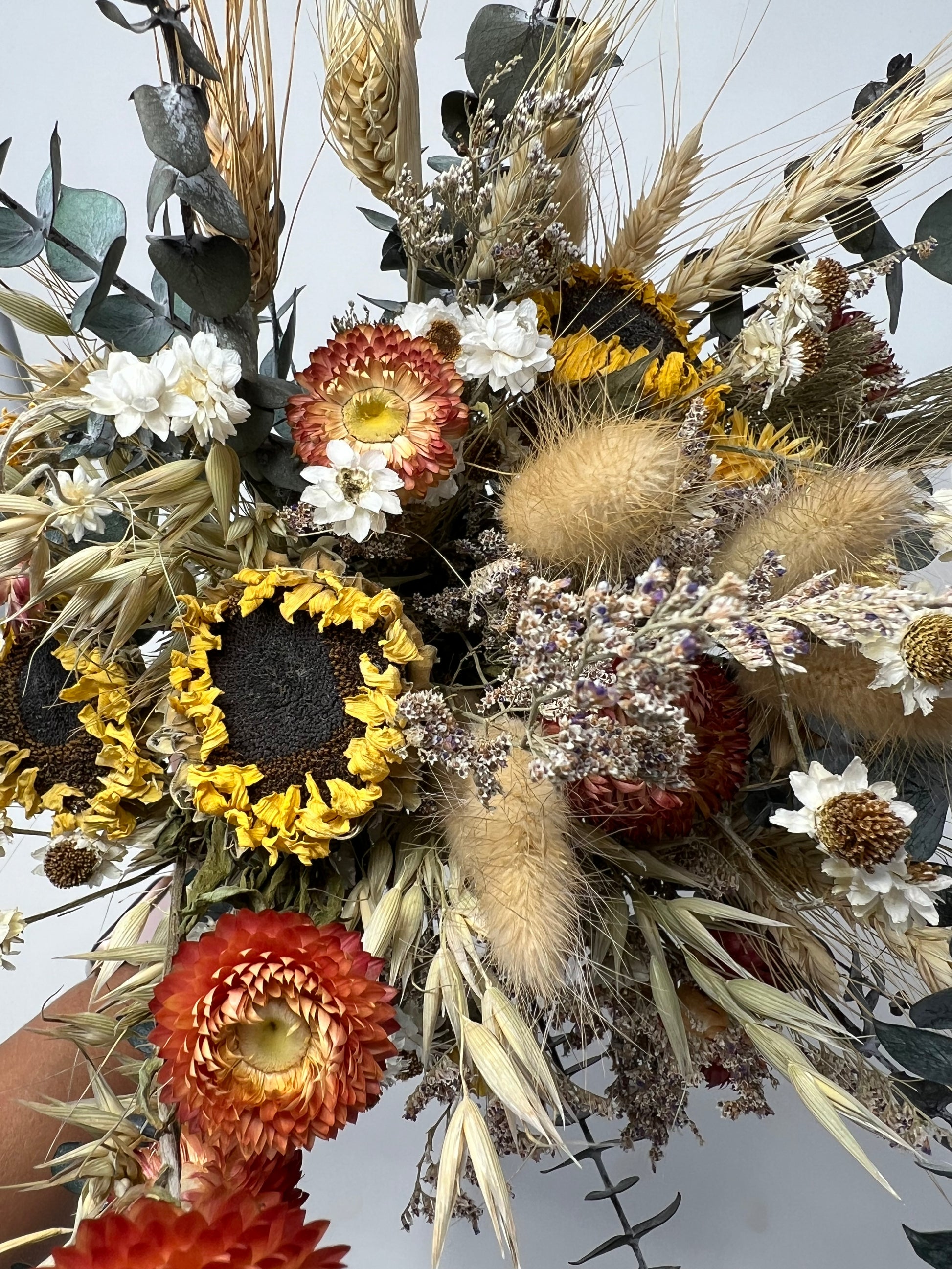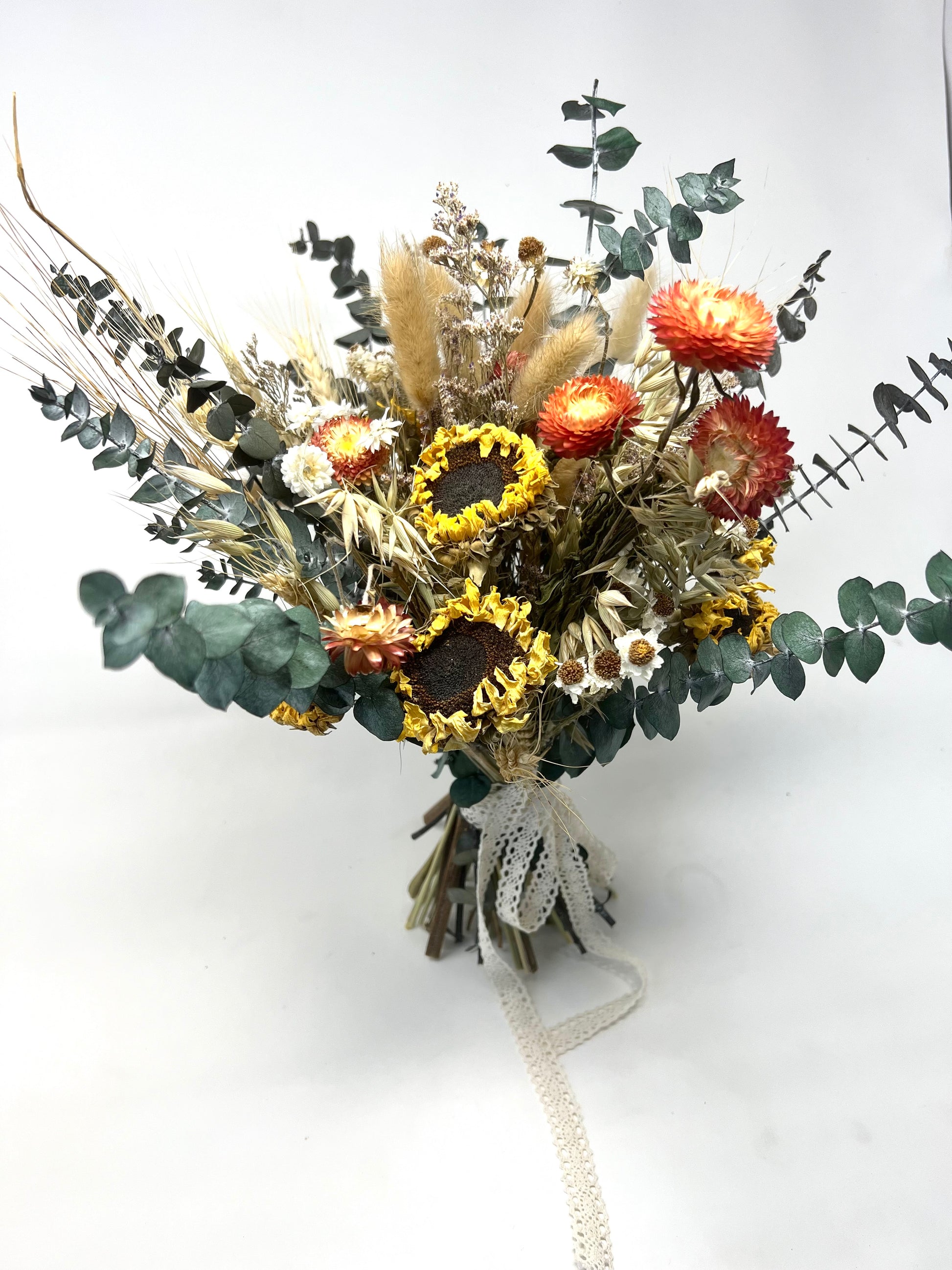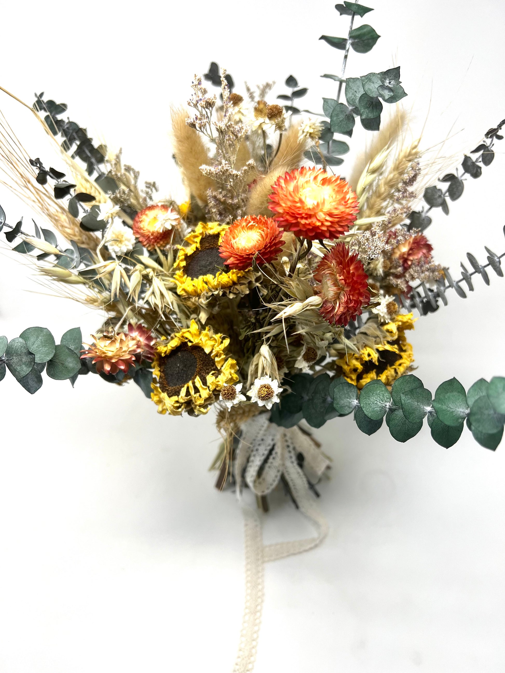 Enhance your wedding or home decor with this versatile boho sunflower bouquet, perfect for both bridal use and as a stunning floral arrangement. Handcrafted with dried and preserved flowers, including sunflowers, strawflowers, and wildflowers, this bouquet is ideal for rustic or bohemian weddings. Available in various sizes: bridal, bridesmaid, mini, or toss bouquets, and complemented by matching boutonnieres, hair combs, and corsages. It also makes a long-lasting, eco-friendly centerpiece for your home or special event.