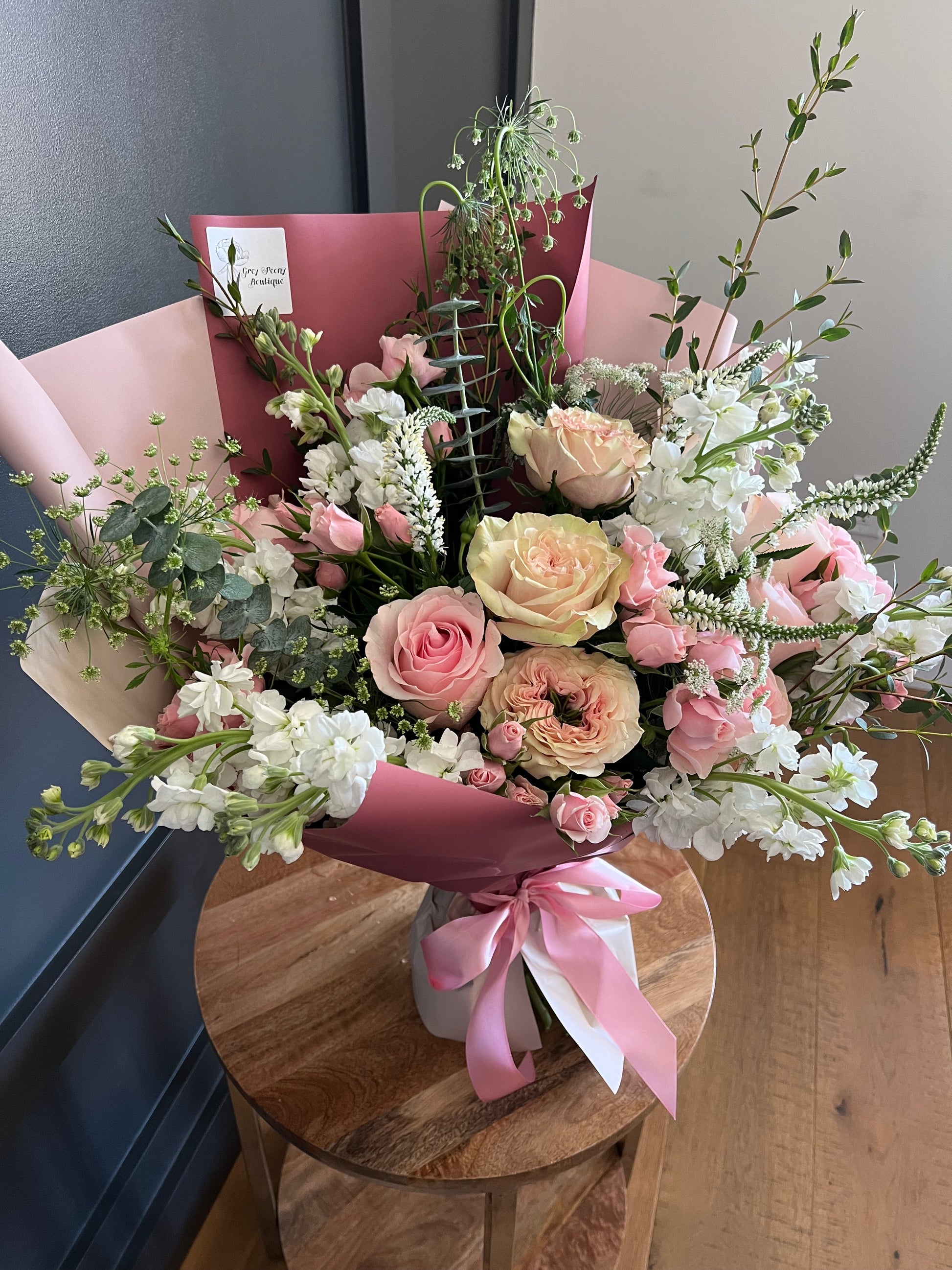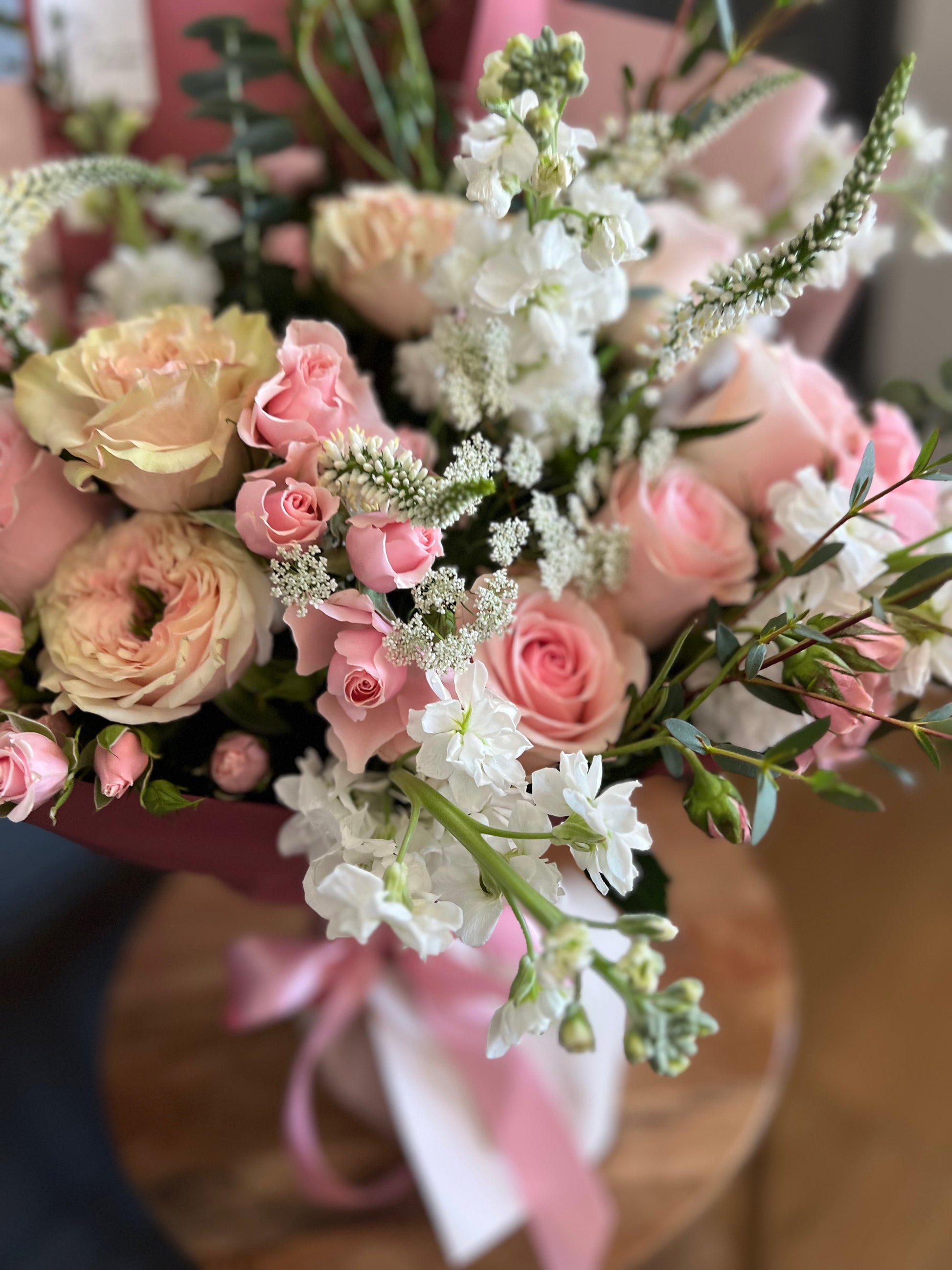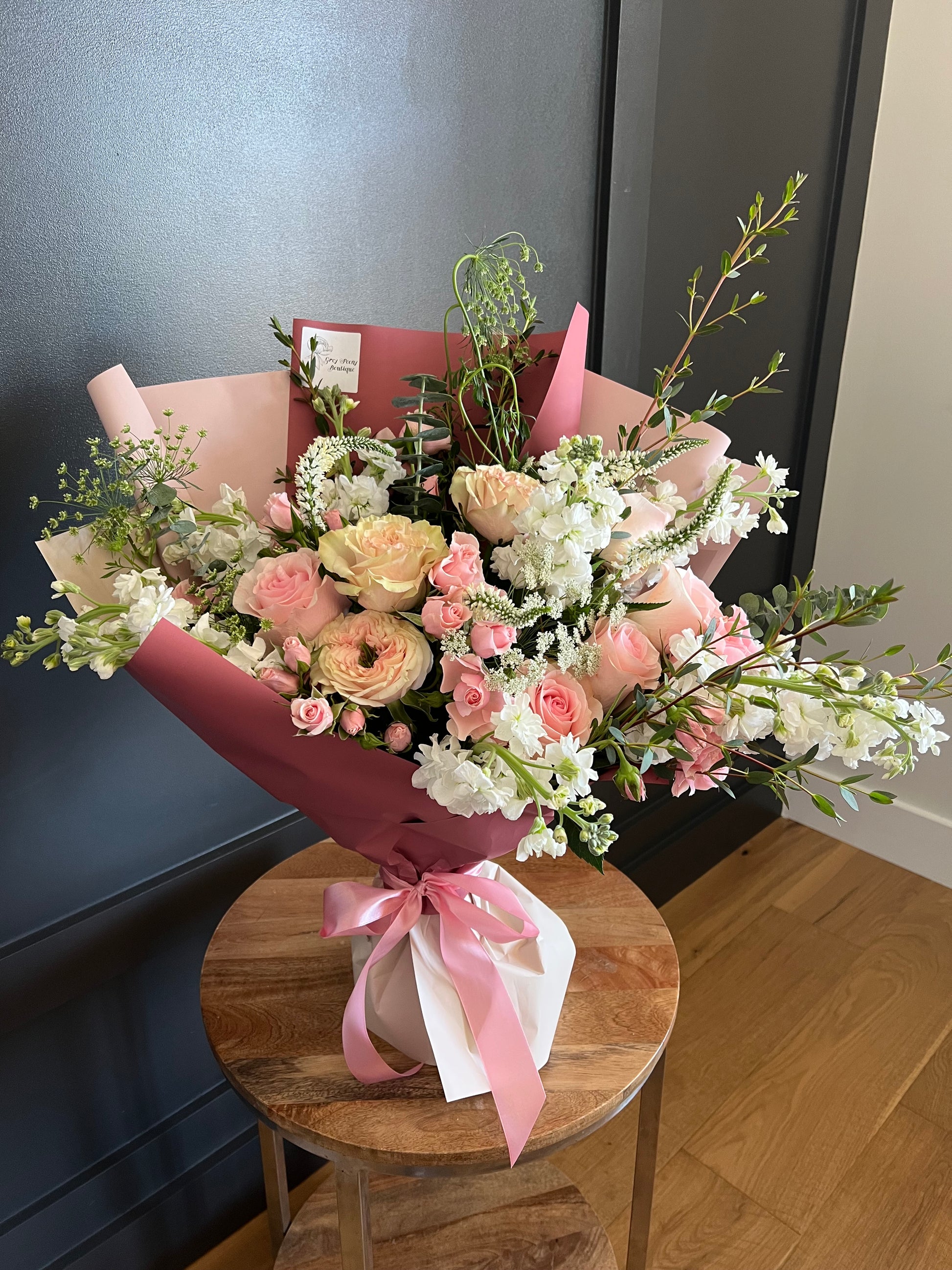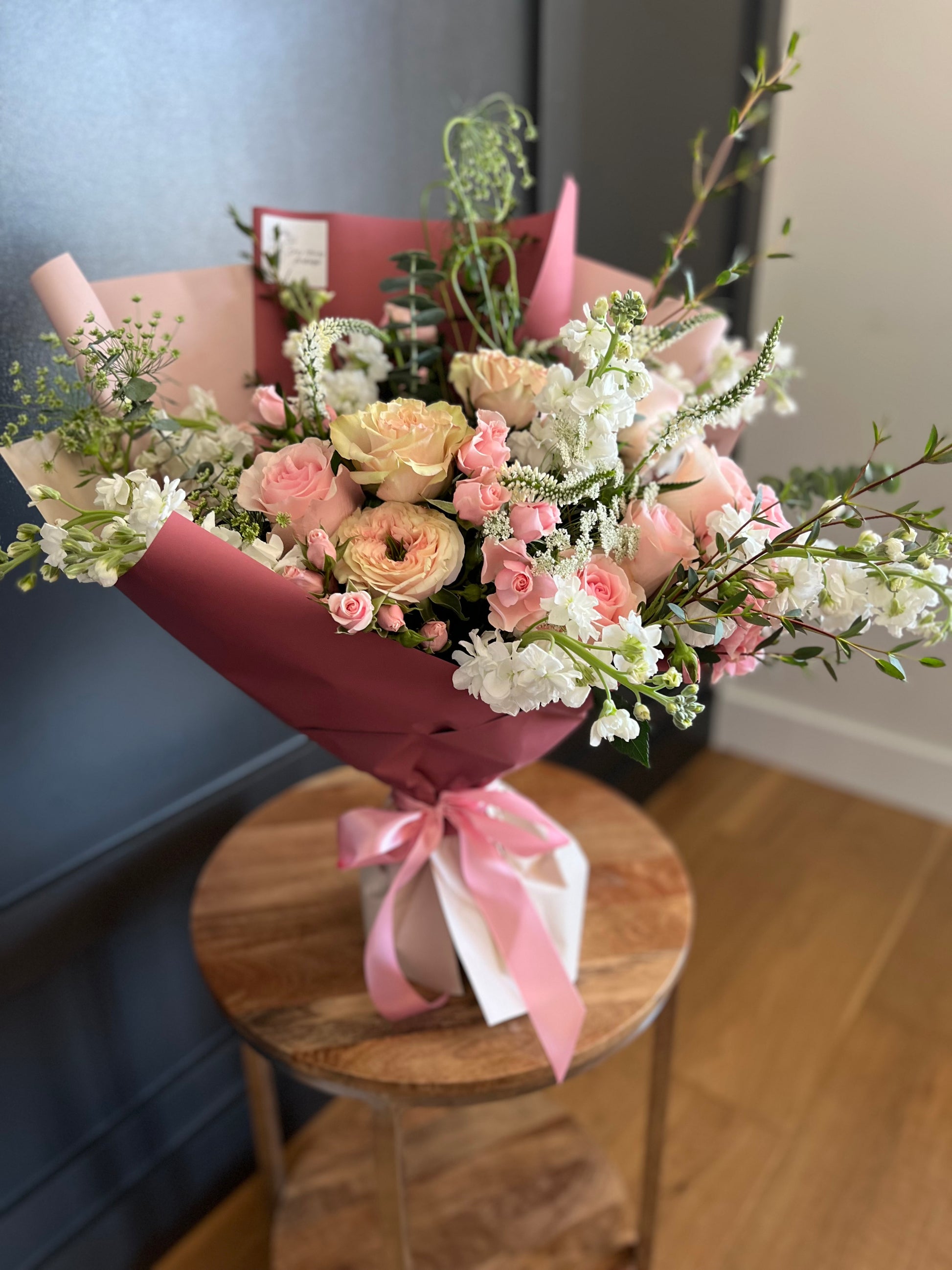 Each bouquet is carefully crafted with premium, seasonal blooms, wrapped in elegant paper and tied with a delicate ribbon for the perfect finishing touch. Whether it’s a small gesture or a grand statement, our bouquets are designed to make hearts bloom!
