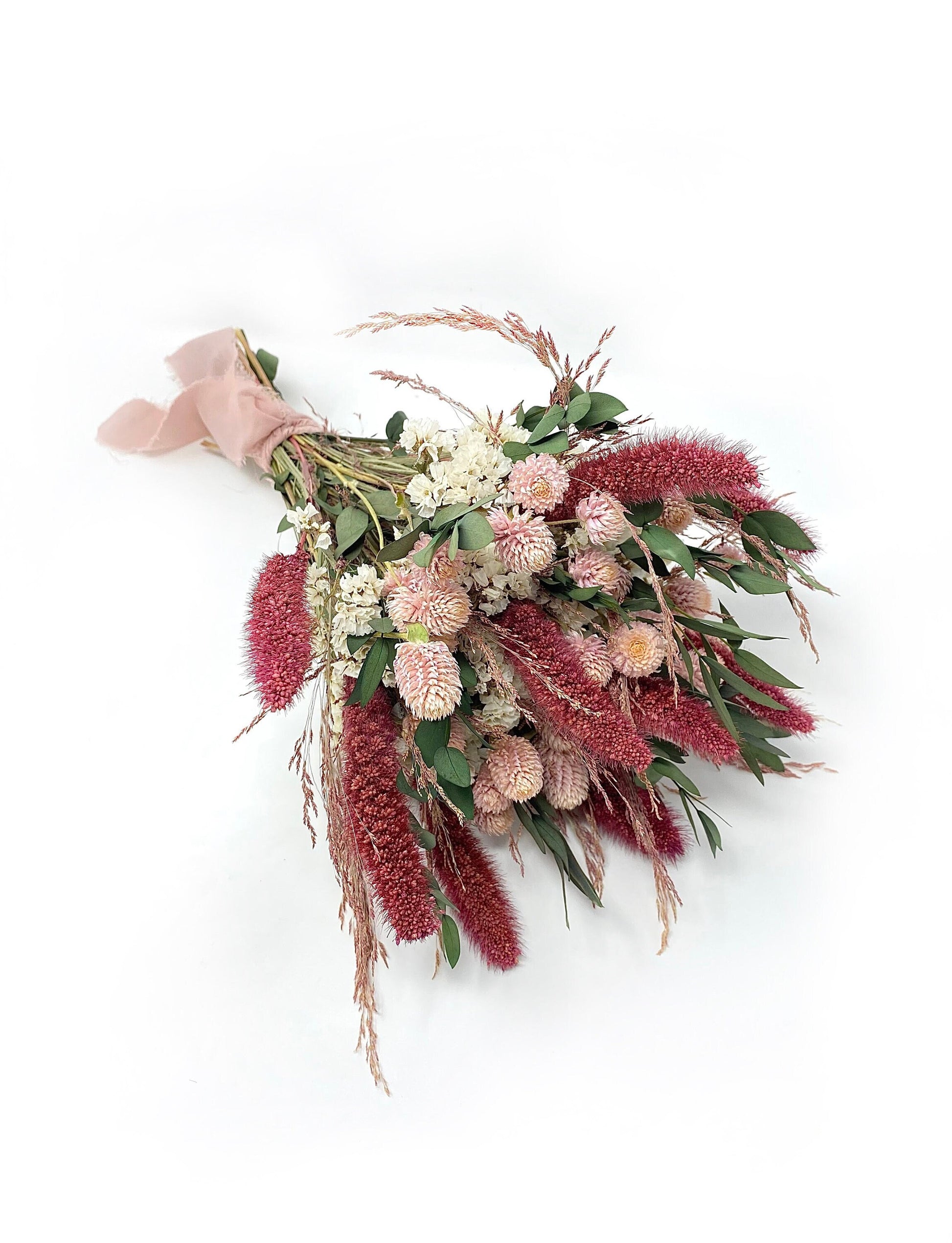 Wedding Bouquet, Dried Flowers, Majestic, Preserved Floral, Bridal, Ribbon, Pink Bouquet, Green and White, Red Silk, Summer, Spring, Gift